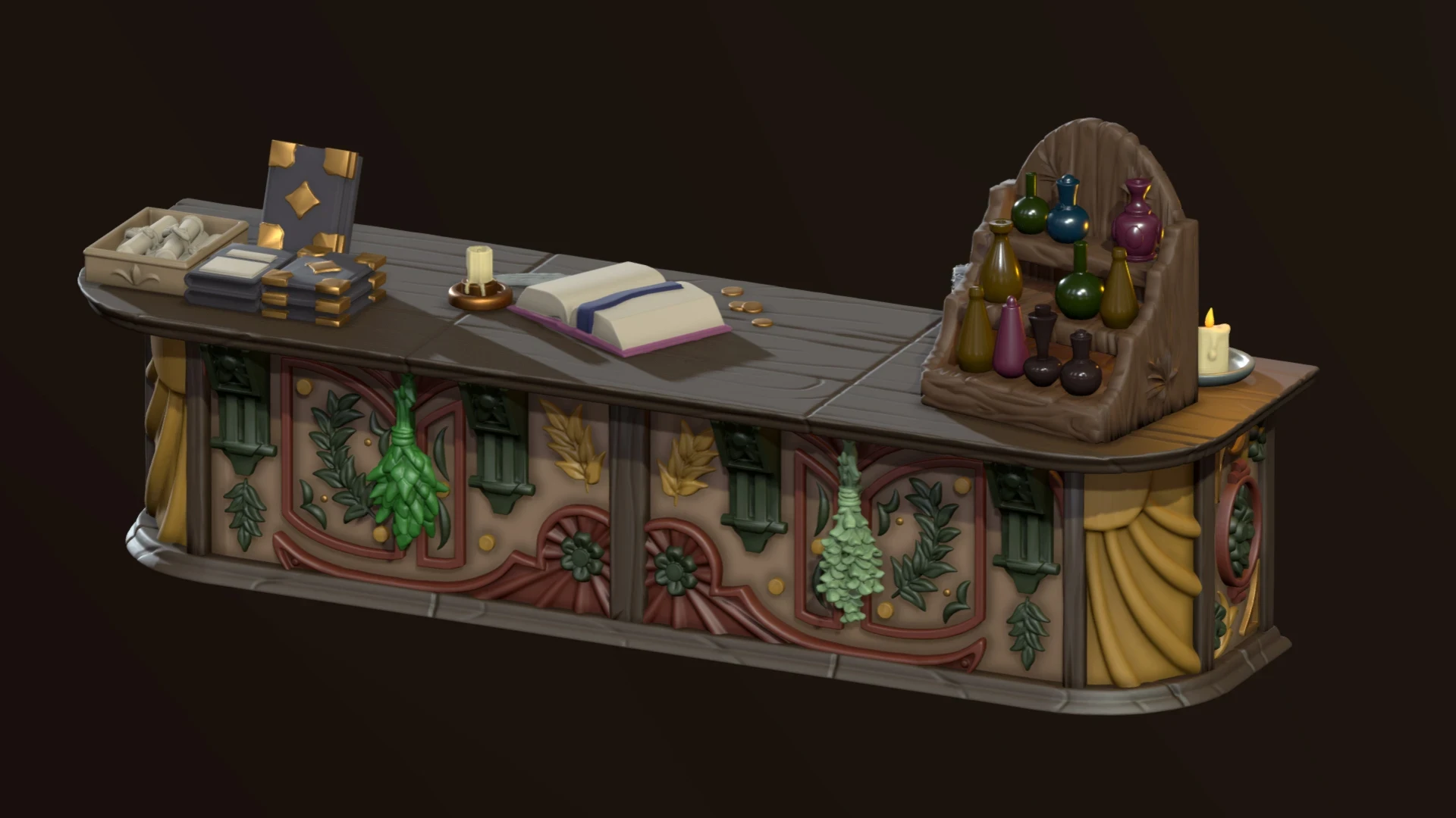 Shelves , workbench, and sales counter in a herbalist’s shop and apothecary. 3D printable miniatures for DnD and tabletop RPGs Created for Infinite Dimensions Games: https://www.infinitedimensions.ca/product/3d-printable-herbalists-furnishings/